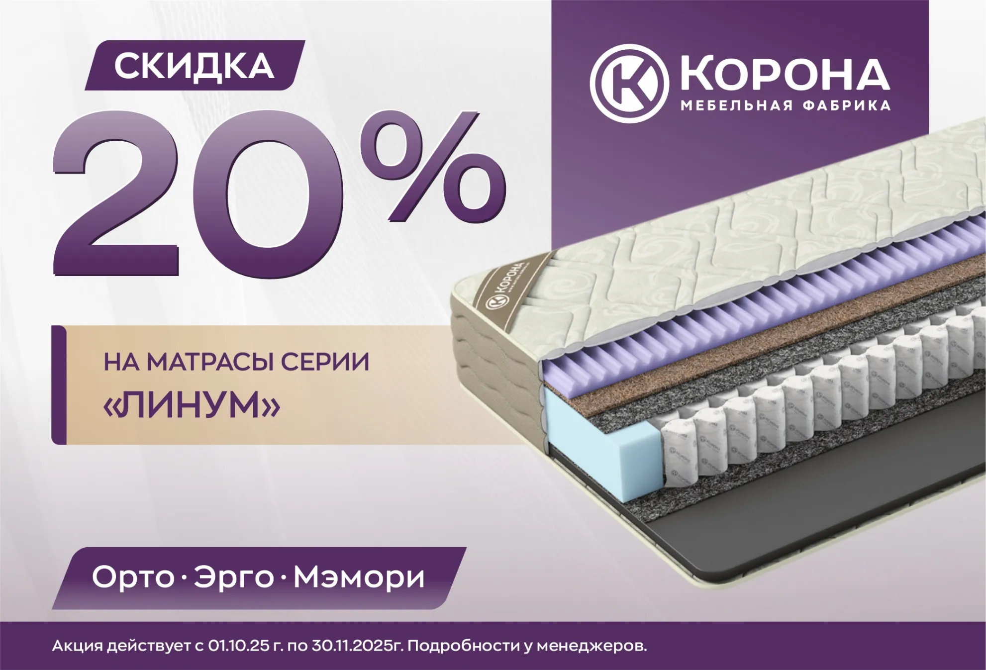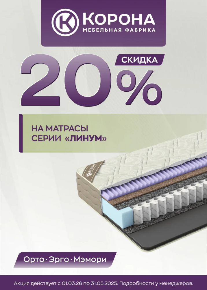 Спешим сообщить о старте выгодного предложения! Только до 31 мая 2026 года на все матрасы серии «Линум»: «Мемори», «Орто» и «Эрго» действует скидка 20%.